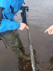 Having made the 12 hour journey to Assynt, northwest Scotland, the day before, we set out to find a suitable field site for coring. The job was made slightly more difficult by the wet weather the area had received over the weekend, which meant that the water level was much higher than usual. Eventually though, we found a suitable site. Jerry sampled the area using a gouge and the sediment showed a clear transition from organic to marine sediment, showing a change in sea level.